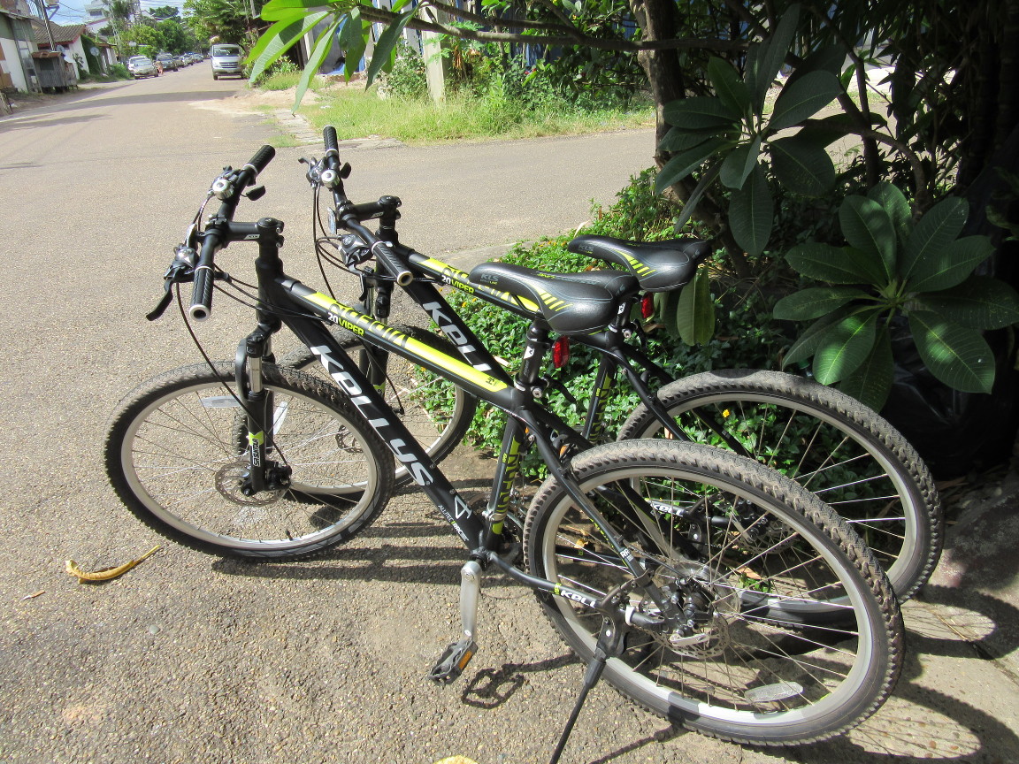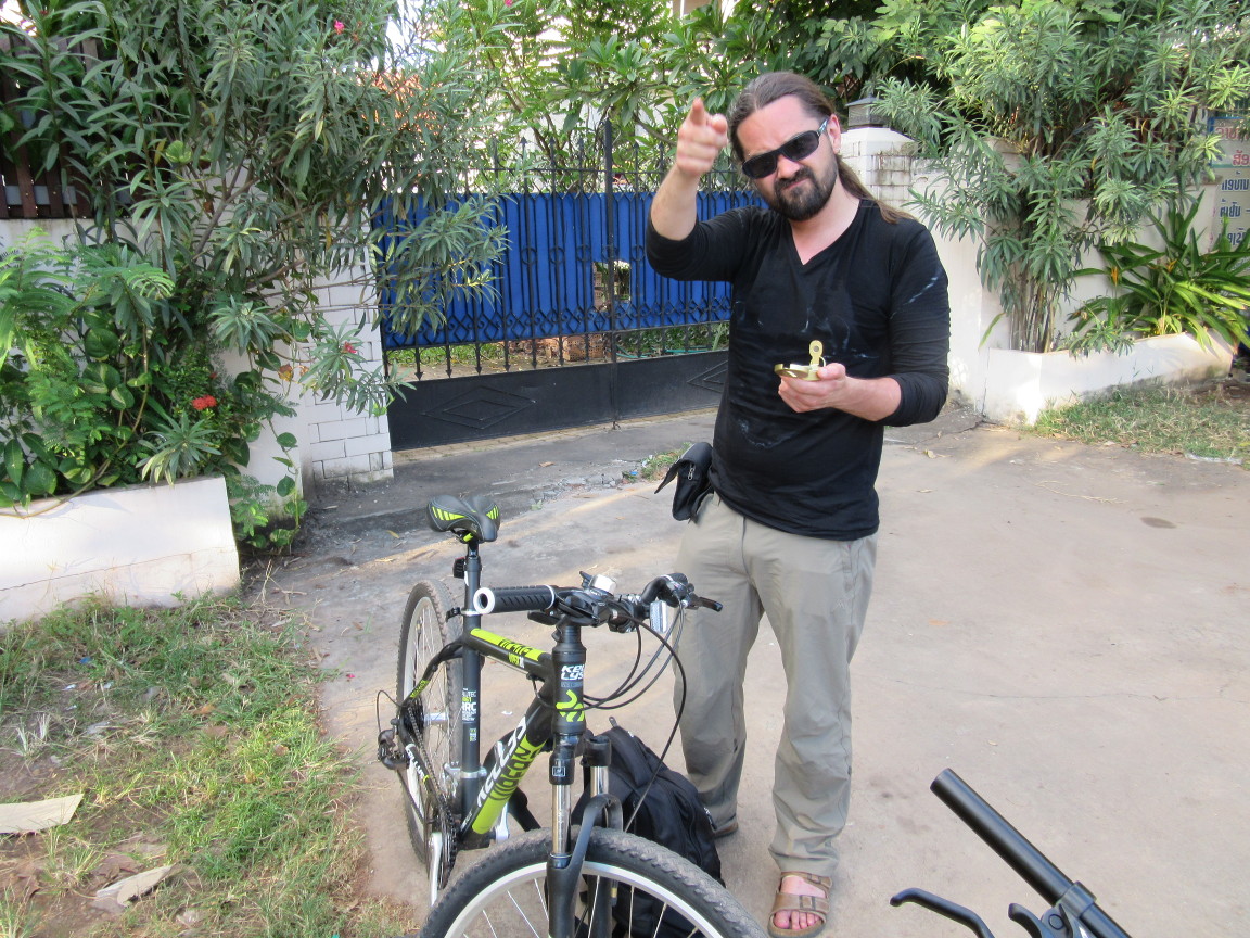 Die Räder sind prima! Niegel-nagel-neu und recht günstig. Den Tip haben wir von der Zirkusdirektorin bekommen: “Der Laden heisst Mixay irgendwas, geht einfach hinter der Beerdigungsgesellschaft, die schon seit Tagen auf beiden Seiten der Straße alles blockiert mit Stühlen, Tischen, Essen und so, nach rechts“. Danke. Super Laden, super Service. Zwar hatte eines anfangs ein kleines Klappern aber getauscht gegen sein Zwilling konnte es dann direkt losgehen. (Wäschesack noch schnell ab ins Zimmer).