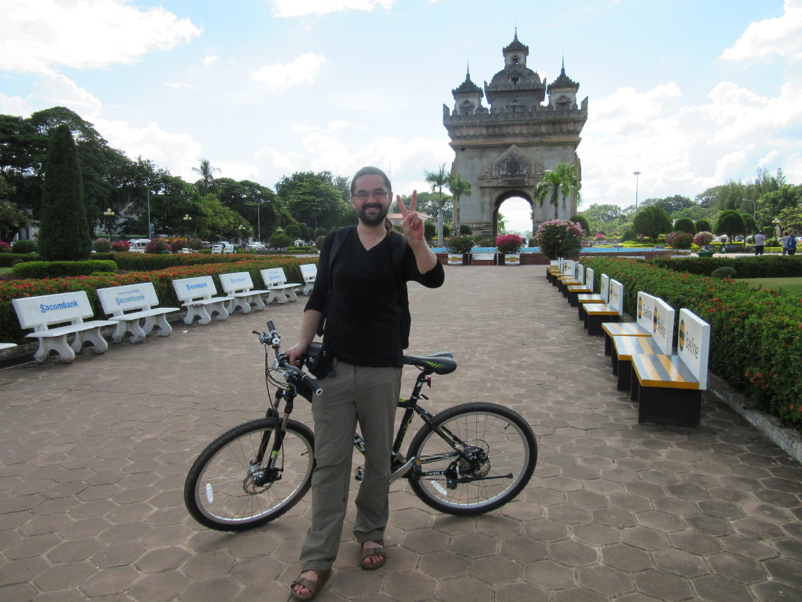2 Fotokopien und ein pdf später sassen wir auch schon wieder im Sattel unserer Stahlrösser. Als anständige Verkehrsteilnehmer entlang einer Einbahnstrasse war uns nun die Richtung vorgegeben, weiter flussaufwärts. So gelangten wir zum Präsidenten-Palast. Ein feudales Gebäude, hoch umzäunt. Welches sicher seine architektonischen Finessen hat aber unsere Augen waren sofort nach links gelenkt wo sich am Ende des breiten mehrspurigen Boulevard ein triumphbogenartiges Gebäude erhob. Da war alles klar, Fahrräder, Triumphbogen und los gehts! Tour de France lässt grüssen. Hier fingen wir schon ein wenig an, die üblichen Verhaltensregeln der laotischen Mitstreiter im Straßenverkehr zu unseren Gunsten zu interpretieren. Aber das tut man gerne um Bilder wie diese zu haben mit dem einsamen Radler auf das Ziel zu.