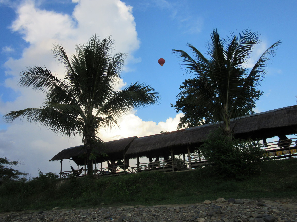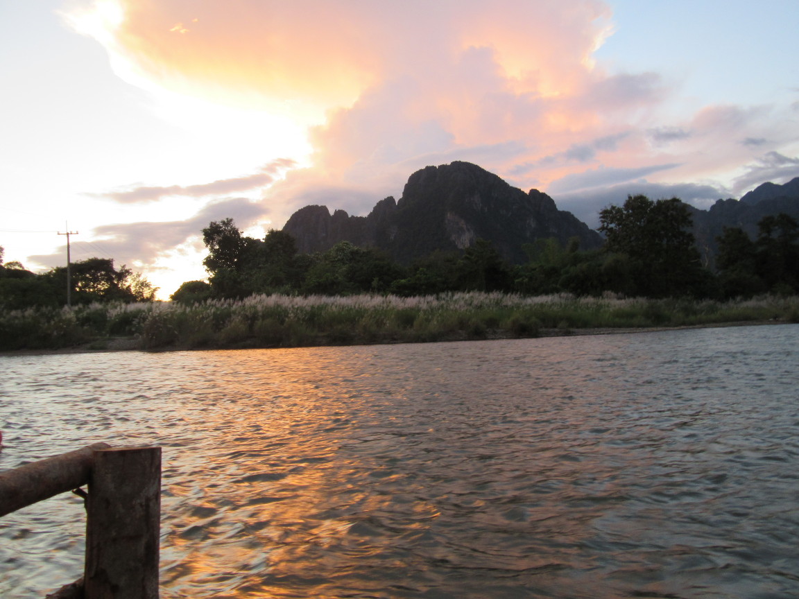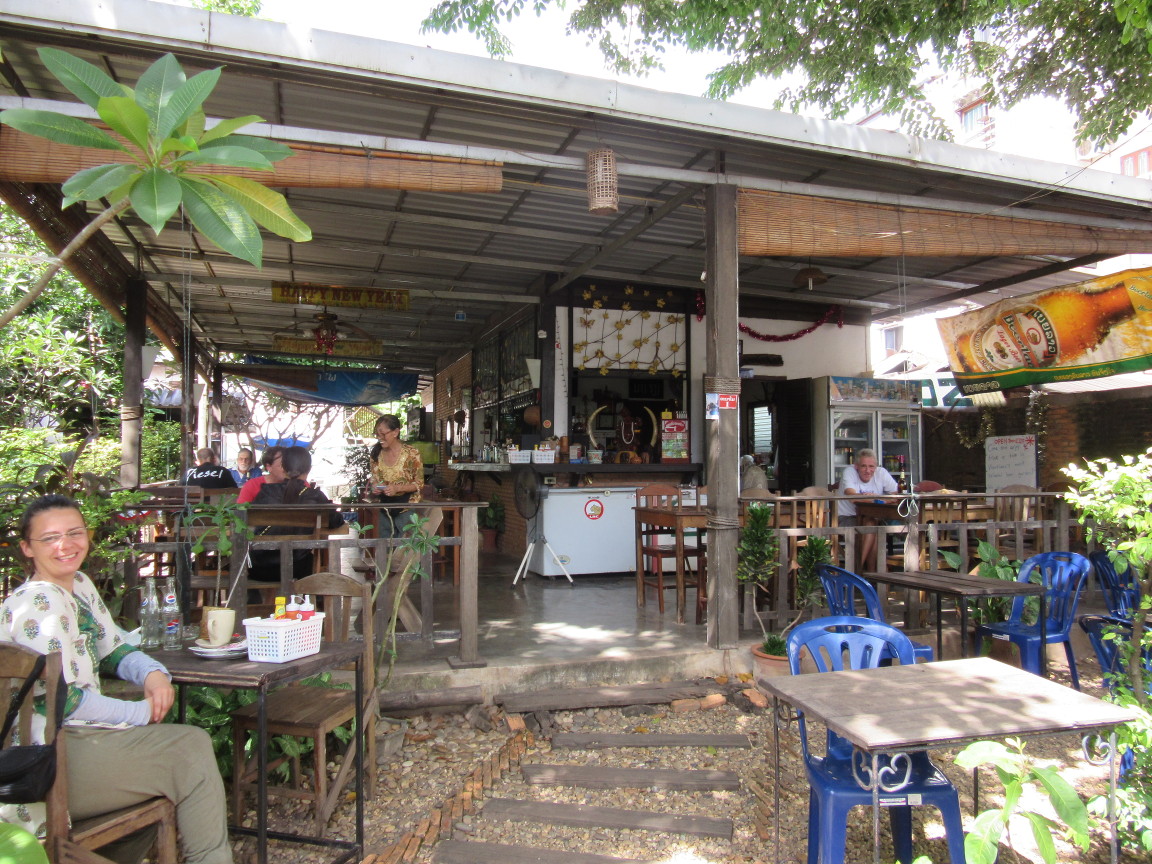 Bei der Ankunft hat Jochen zum Glück mitbekommen wo die Party-People ihr Lager aufzuschlagen gedenken (Pan’s Place). Wir entschieden uns kurzerhand für eine Herberge ganz am anderen Ende der Gegend. Auf unsere Frage ob die Richtung (wir deuteten nach Osten) richtig wäre und ob man laufen könne, wenn das Ziel Campa Lao wäre, erhielten wir zur Bestätigung ein freundliches heftiges Nicken. Es war allerdings sowieso kein Tuk-Tuk in der Nähe und so schulterten wir das Marschgepäck und wackelten los in die angegebene Richtung. Aus reiner Intuition hielten wir das (scheinbar einzige) Tuk-Tuk an, dass offenbar wieder zurück gefahren kam und liessen uns zu besagter Herberge fahren. Natürlich war es sehr sehr weit – man hätte laufen können aber wäre erst lange Zeit später angekommen – und nicht ganz in der angegebenen Richtung – ein kleiner aber wichtiger Schlenker Richtung Fluss runter war unabdingbar. Wir lernen es wohl nur sehr mühsam, nur weil die Antwort freundlich und bestimmt ist, muss sie eben doch nicht unbedingt richtig sein. Am Ziel angekommen dämmerte es gerade. Wir waren uns sofort einig: das Etablissement ist das Plätzchen unserer Wahl. Schnell ankommen, auspacken und los, essen suchen.