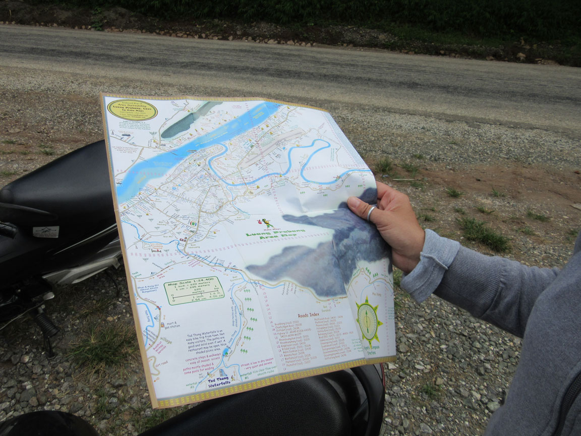 OK, dann zur Adresse seiner Webseite. Von freundlichen Laoten wurden wir wieder mal hierhin und dorthin geschickt. Es ist wie in Indien: Bevor man zugibt dass man einfach nicht weiss wo die Strasse ist deutet man einfach in irgendeine Richtung.