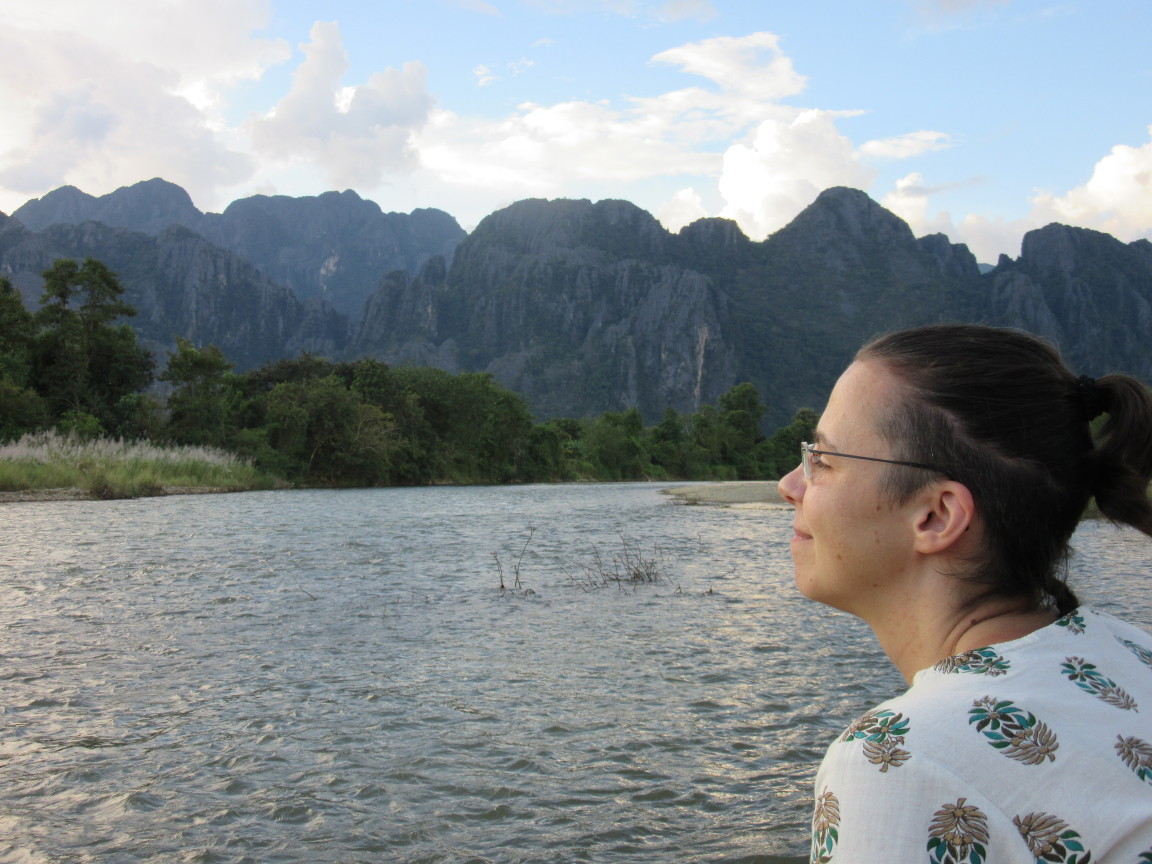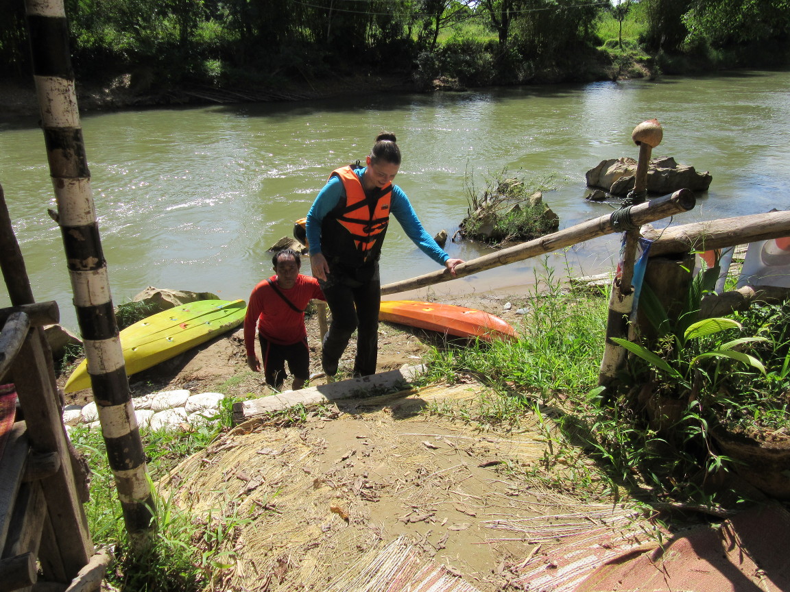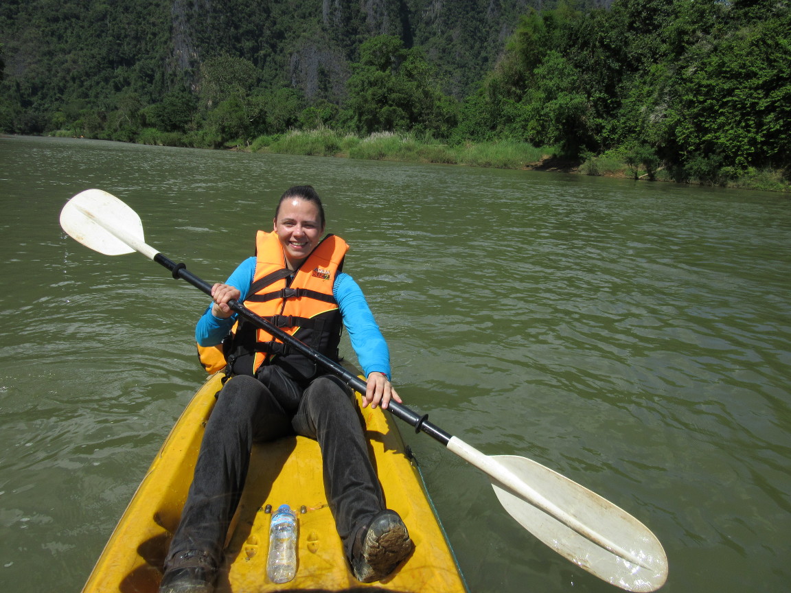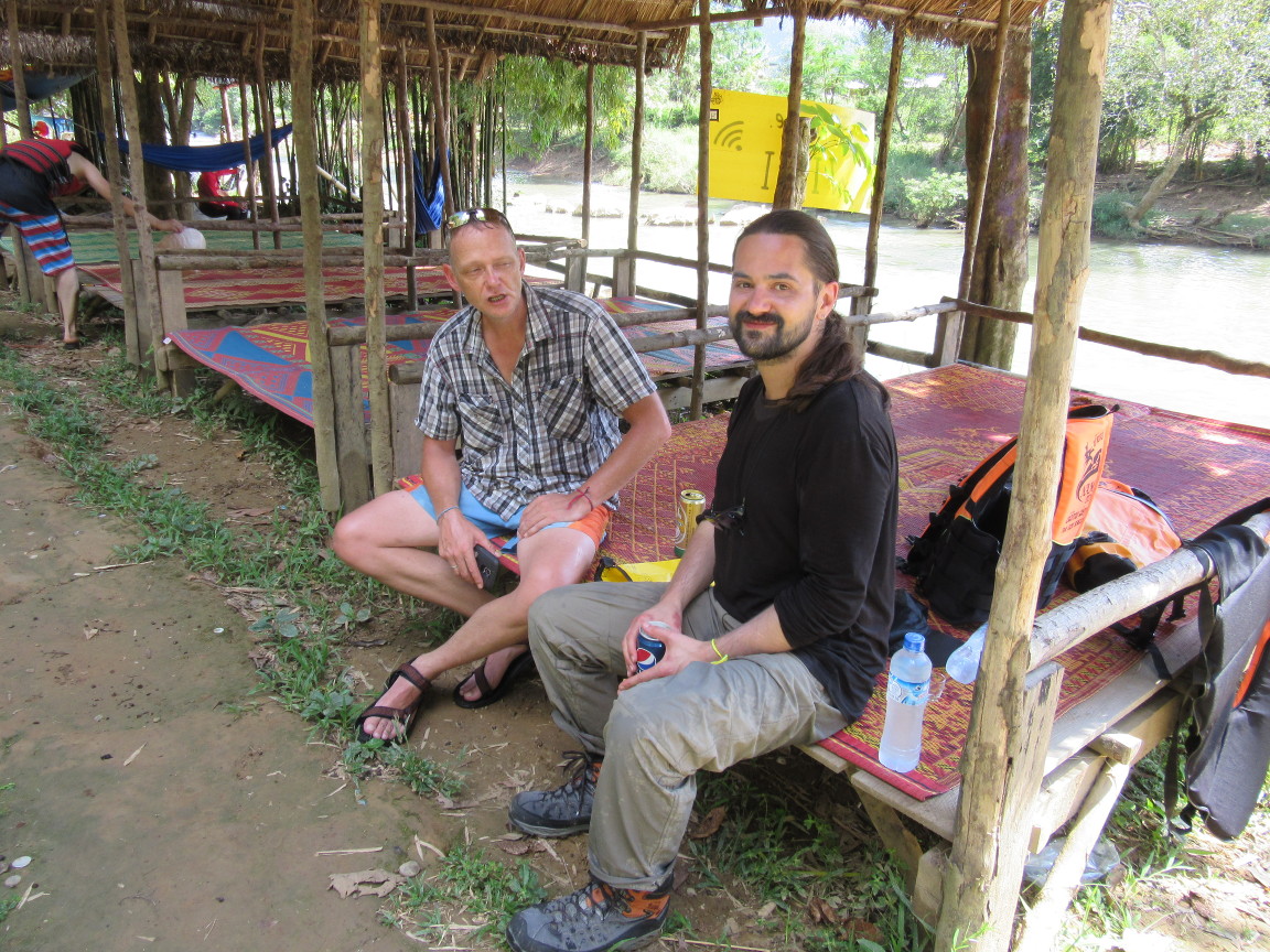 Wie immer – was rein geht muss auch wieder rauskommen. Bart musste also mal aufs Klo. Und wieder an der Hängematte angekommen war Claudia plötzlich nicht mehr allleine. Der Besitzer derselber sass plötzlich auch mit rum. Wie sich herausstellte war er überhaupt nicht sauer, sondern Alleinreisender Holländer. Und dazu noch Polizist. Und schon das zweite Mal in Vang Vieng. Dazu noch gesellig, gesprächig und gemeinsamen Aktivitäten nicht abgeneigt. Die erste Erwiederung auf unsere Aussage wir wollen mal Kajak fahren gehen war: „Cool, can I join you?“. Wir waren nicht abgeneigt, da sich ja herausstellte, dass J. (so darf man ihn nennen, wenn man seinen Namen nicht ordentlich aussprechen kann) uns ja einige Vang Vieng Erfahrung voraus hat.  So verabredeten wir uns kurzer Hand für den nächsten Morgen um 7:30, ja, nein, richtig gelesen, das soll sieben Uhr dreissig heissen! Der nächste Morgen, sieben Uhr fünfundzwanzig Claudia ist wach, geduscht, angezogen, fertig und startklar.