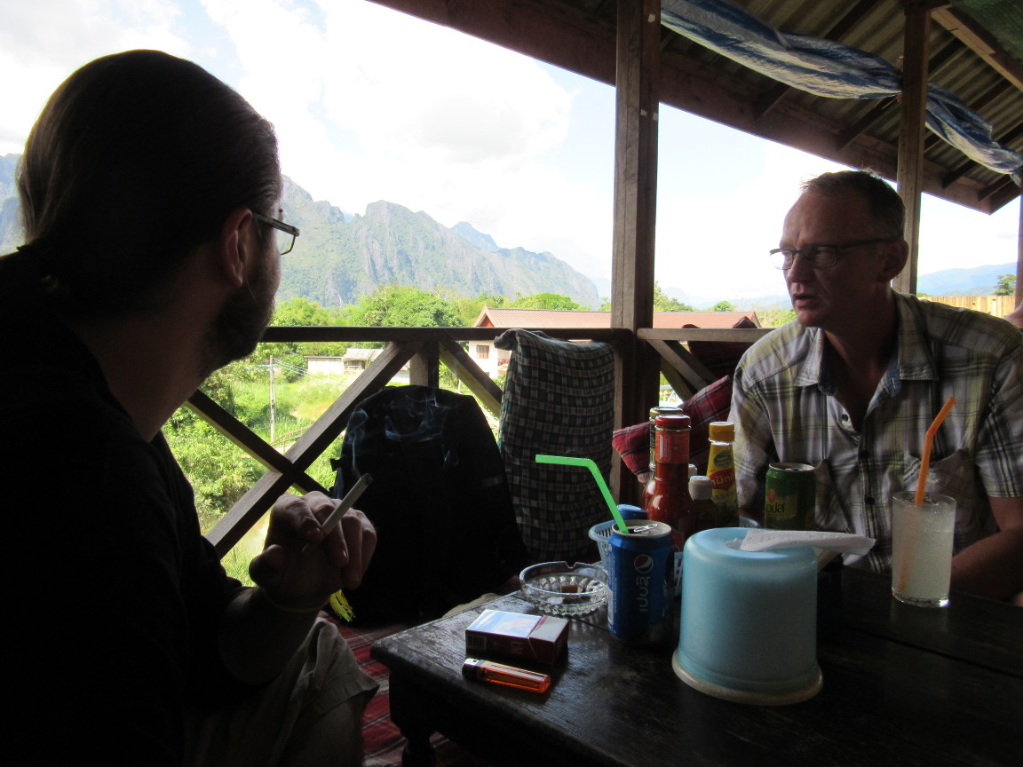 Nun wollen wir weiter nach Vang Vieng.Tja, Vang Vieng. Zunächst wollte Jochen hin und Claudi nicht. Beides aufgrund von Dokumentar-Filmen im Internet. Die schönen zeigen die unglaubliche Landschaft. Die anderen zeigen die wilden Horden grölender, betrunkener Feierteens und -twens. (und -thirties). Eine schwere Entscheidung aber am Ende doch klar. Keiner von uns will  inmitten von respektlosen Fereng (Wort für Ausländer?) massentouristische Ballermann-Szenen erleben und sei die Landschaft auch noch so schön. Dann wollte Claudi Hin und Jochen nicht. Denn pro: es liegt sowieso auf dem Weg nach Luang Prabang und man kann prima die Reise in zwei Hälften Teilen. Andererseits, contra: wir haben sowieso so wenig Zeit übrig. Lieber gleich durchfahren und die Tage im Norden nutzen. Letztlich hat jedoch die Neugier und die Weisheit gesiegt. Wann kommt man schon wieder hier hin? Welchen Sinn macht es etwas auszulassen was sich sowieso anbietet? Und wer will schon 10 Stunden am Stück im Bus sitzen? Gut, Vang Vieng wir kommen. Dorthin bringt uns ein Mini-Van. Der fährt ganz früh und einer fährt auch 13:30. Den nehmen wir. Als wir am Siri (Syri) abgeholt werden entsteht gerade der vorherige Blog-Post. Schnell Laptop zu und auf zum Wagen. Doch was sehen meine Augen da? 5 (gefühlte 25) alkoholisierte, laute, halbnackte Australier / Engländer. Örks na das wird bestimmt ein Spaß! Wir steigen vom Lasten-Tuk-Tuk in den Mini-Van, weitere Backpacker gesellen sich zu unserer munteren Gruppe. Mini-Van voll, die Jungs vor uns auch und los geht es.