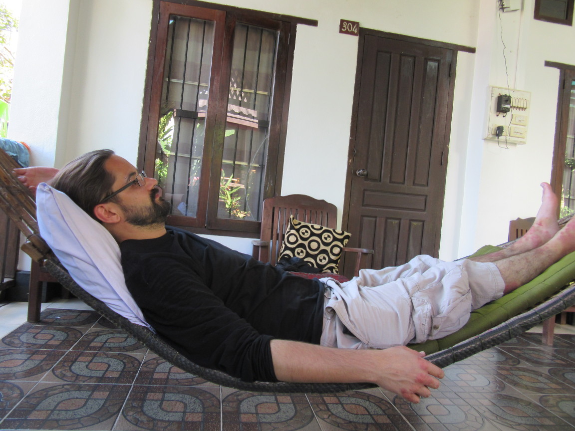 Aber an Heia war nicht zu denken. Nein nicht wegen feiernder Horden, es war einfach zu einladend sich im schönen Innenhof auf ein weiteres Beerlao in der Hängematte noch ein wenig das laue Abendlüftchen um die Nase wehen zu lassen. Und wo einer sitzt, da sitzen auch zwei und dann dauert es nicht lang werden es drei. Das Zimmer neben der Hängematte hinten links gehört J. aus den Niederlanden. Und da saßen wir nun und plauschten. Und wer wissen will wie der unternehmungslustige J. unseren Tagesablauf bereichert, der lese gerne den nächsten Artikel.