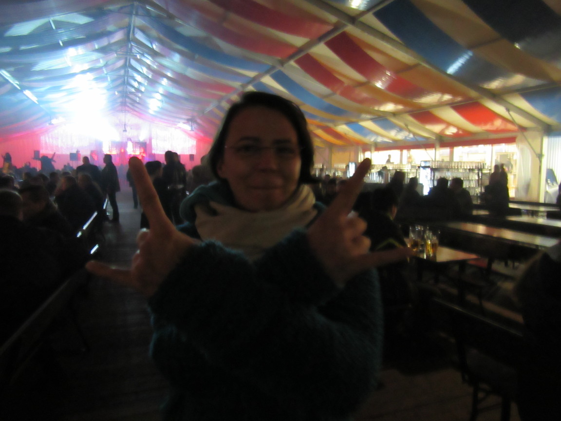 Auf den Toiletten spielten sich zu späterer Stunde unglaubliche Szenen ab. Total betrunken war ja eigentlich jeder, aber der eine verträgts halt besser als der andere. Schwankende Finnen die ihren Hosenstall nicht mehr zubekommen haben und die kleine Holztreppe fast heruntergepurzelt sind. Daneben zwei Männer die irgendwie ihre Brüderschaft feierten und sich ewig lang und herzlich drückten und auf den Rücken klopften. Ich sach Dir … Verbrüderung pur! Schön auch die Bedienungen in einer Mischung aus Dirndl und finnischer Folklore, die auch mal mit auf die Bänke stiegen und mitgröhlten.