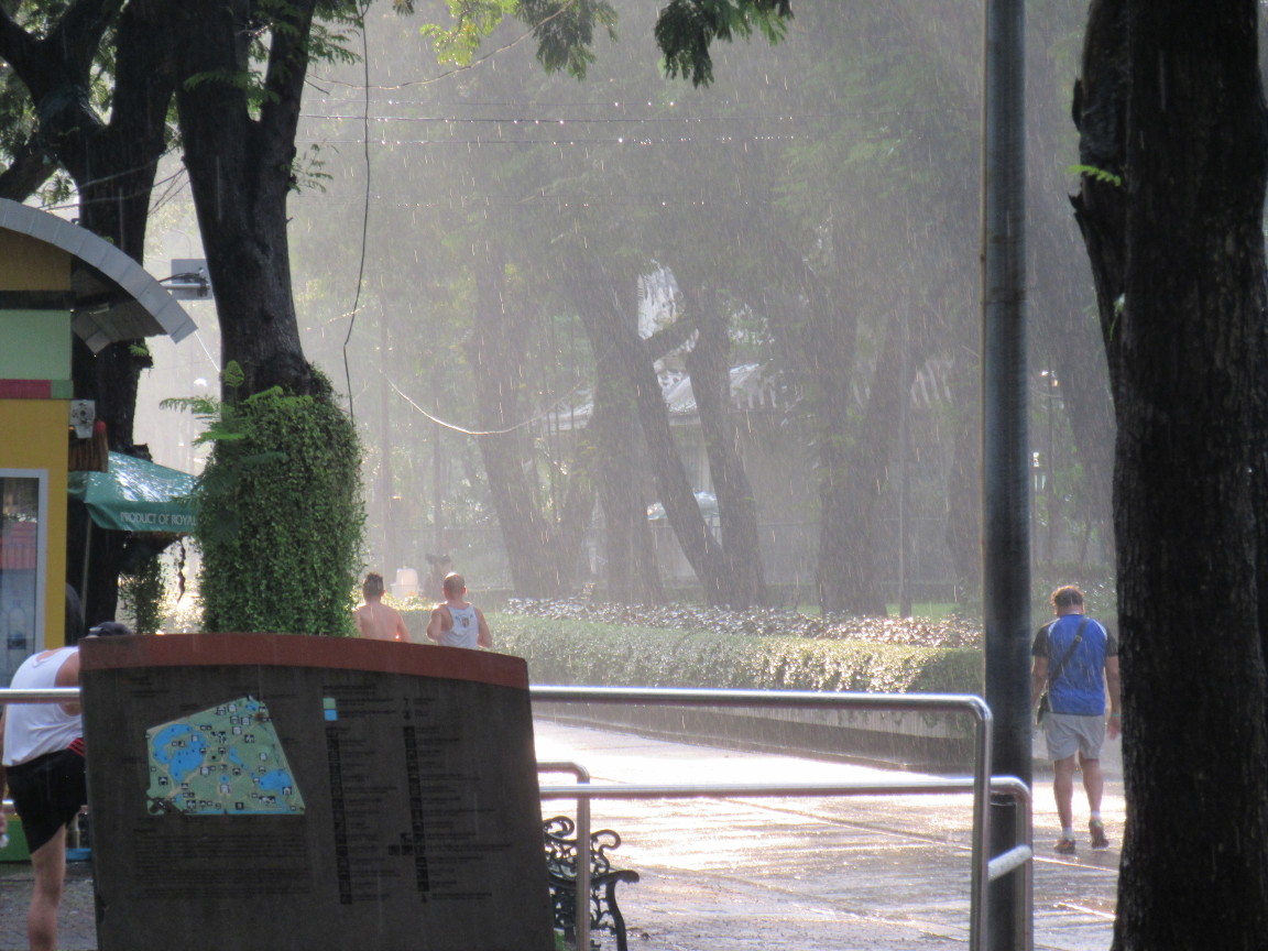 Wir wollten eben den Park verlassen, da wurde aus dem Geniesel, das begleitet von Donnergrollen die ganze Zeit schon über dem Park hing, ein hübscher, heftiger, tropischer Regenguss. Zum Glück hatten wir eben beschlossen noch schnell die örtlichen Ver- und Endsorgungseinrichtungen aufzusuchen. Unter dessen Dach suchten in der Zwischenzeit mehr und mehr Läufer Schutz irgendwann hatte ich den Eindruck es müsse eine Laufveranstaltung stattfinden aber es waren wohl doch nur die üblichen Sonntagsatlethen auf ihrer gewohneten Runde. Recht viele Europäer übrigens, die alle wirkten als betrieben sie auch Feierabendsport hier mit all den asiatischen Kollegen. Wer würde auch zum joggen extra nach Bangkok fliegen?