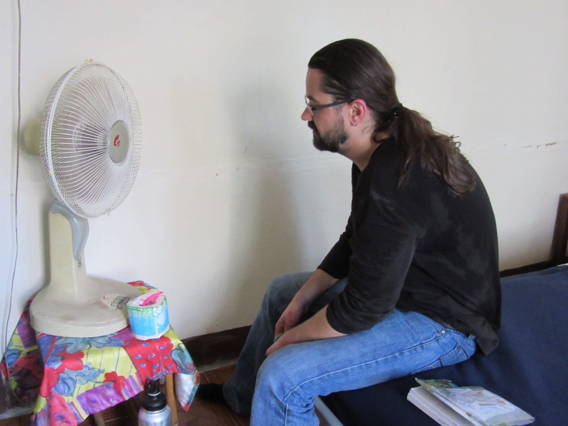 Als nächstes die Suche nach der Unterkunft. Die Francoise Road mit sehr vielen Guest Houses war uns dann doch zu „Backpackerig“. Viele Unterkünfte, aber Preis/Leistung irgendwie hmmm. Aber was ist es was wir suchen? Wissen wir auch nicht, einfach weiter schauen. Weiterschauen bedeutet aber auch weiter latschen und das mit vollem Marschgepäck, in der Mittagshitze, schööön! Und an jeder potentiellen Unterkunft die gleiche quälende Frage: “Nehmen wir dies? Weiss nicht lass mal ein Zimmer ansehen. Puh echt?“ Na dann eben weiter eiern. Und manchmal übernimmt das Universum dann die Regie. Wir suchten und fanden eine nette Seitenstraße mit einem netten kleinen ruhigen Guesthouse. Leider closed for Renovation! Aber dann kommt die Besitzerin raus, sagt uns es wird noch 2 Monate dauern bis man hier übernachten kann allerdings hätte sie auch noch was anderes. Das Siri, nicht weit von hier, direkt gegenüber vom Tempel. Das Siri! Na wenn das kein Wink ist… . Wir also schnurstraks auf den Tempel zu, das Siri suchend und: tja, kein Siri weit und breit. Mann, das ist echt ermüdend, geh mal da und da hin, dann geht man in die Richtung und nix is da. Hier sind Richtungen und Distanzen anders. Ok, nach einigem hin und her haben wir es gefunden und nicht wirklich gemocht. Zu laut, zu klein, zu dunkel. Aber es gibt noch das Siri – übrigens Syri daher auch die Konfusion – also das Syri 1. Das sei viel ruhiger, netter, etc. hier wäre das Syri 2. Also, ein letztes mal aufgerafft und hingschleppt. Und ja wirklich hier ist nett, Zimmer sauber und Preis ist gut, alles fein. Nur Bart war von oben bis unten durchgeschwitzt.