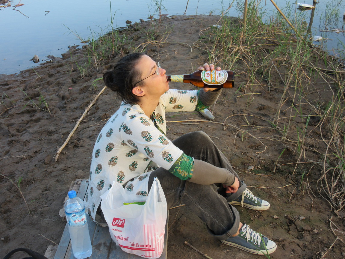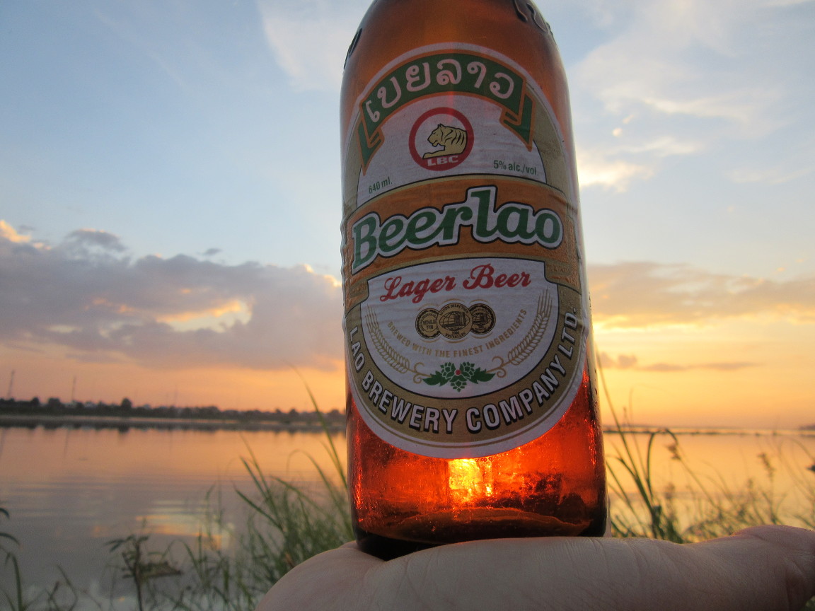 Nachdem wir uns etwas erholt hatten wollten wir nun endlich, endlich wie Dr. Siri und sein bester Freund auf einem Baumstamm am Mekong sitzen und uns das erste, eiskalte Beerlao hinter die Binde kippen. Das Bier war schnell gefunden, das gibts hier nämlich an jeder Ecke wie Leitungswasser. Kostet zwischen 90 Cent und €1,20 und, ich nehme es schonmal vorweg, schmeckt ausgezeichnet. Aber erstmal eine ATM gesucht und hoffen und beten, dass zumindest eine unserer Karten funktioniert. Da Bart klugerweise sämtliche PINs seiner Kreditkarten vergessen hat verlassen wir uns komplett auf Claudias VISA Card und Barts Maestro Card. Aber, was soll ich sagen, die Technik macht auch vor Laos nicht halt und bisher haben wir immer mit zumindest einer Karte Bares bekommen. Was wir wie gesagt in (erstmal eine, wir wussten ja nicht wies schmeckt) Beerlao investiert haben.