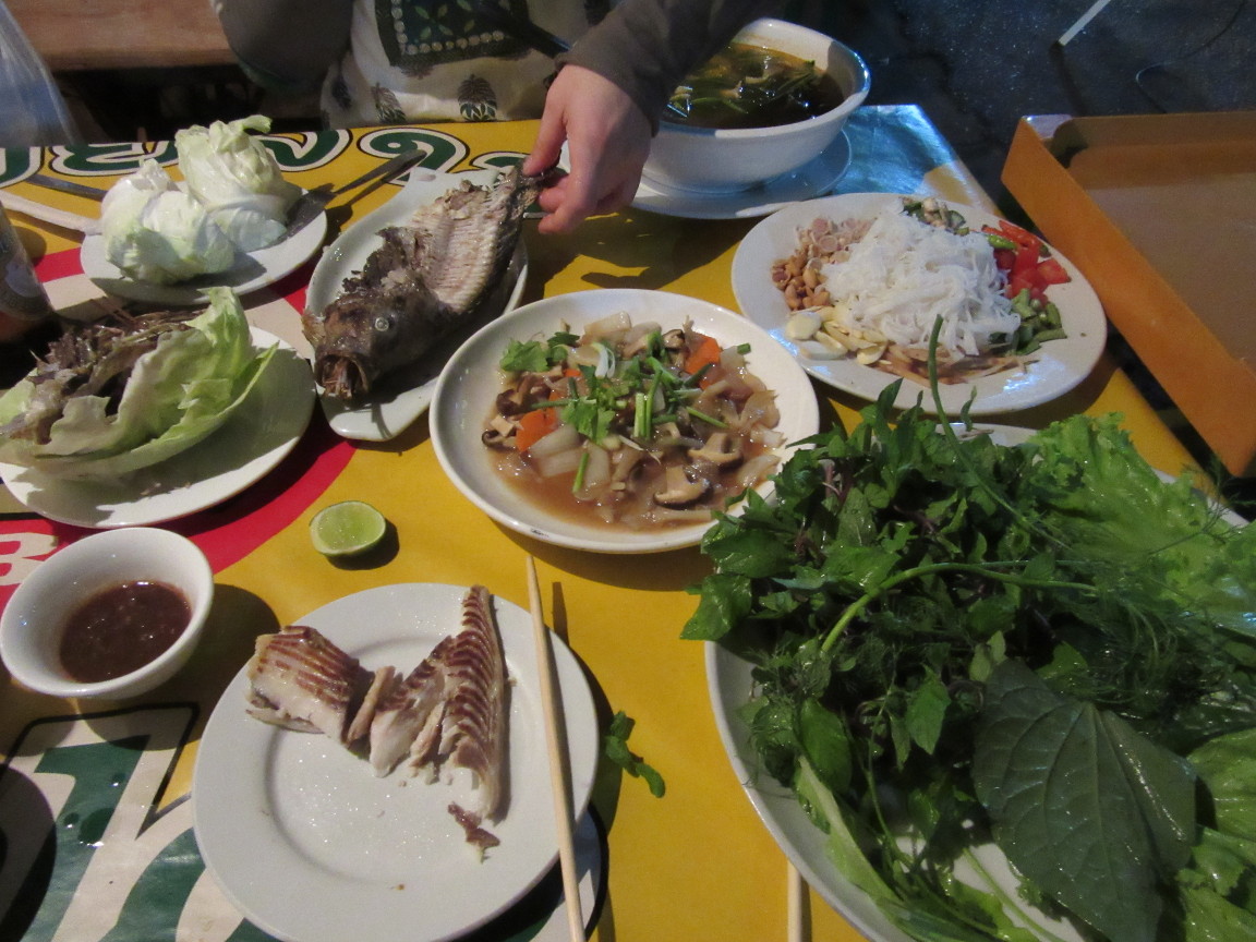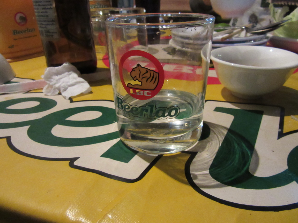 Der Fisch war deliziös. Allerdings kam mit dem Fisch auch eine Platte mit Salatvariationen. Laut Kellner wickelt man in ein grosses grünes Blatt ein Stück Fisch und garniert das mit Beilagen (Knofi, Erdnuss, Nudeln, Passionsfrucht, Minze, Sprossen etc.). Und wer schonmal unterwegs war kennt den alten Spruch. „Cook it, peel it or forget it“. Bart war aber in Abenteuerlaune, konnte das Kilo Grünzeug (inkl. eines halben Weisskohls) nicht liegen lassen und mutierte ob dieser Herausforderung zum Danger Seeker. Immer nei mit! Zum Glück blieb dieses Abenteuer ohne Folgen! Ach ja, unseren ersten laoalo haben wir auch getrunken. Lecker Snapsi!