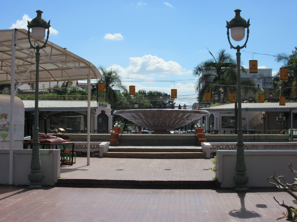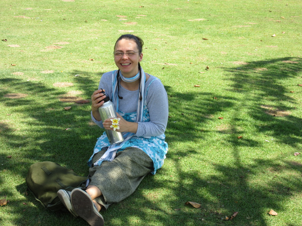 Endlich den Bahnhof erreicht gab es alles was das Reiseherz begehrt: erst Gepäckaufbewahrung, nicht ganz billig und nicht so sehr freundlich aber egal hauptsache aufbewahrt, bis 19:00. Eine Dusche für 20Baht = 50cent, relativ sauber sogar für so einen Durchgangsbahnhof, mach sofort gute Laune! Auch wenn beim Duschen ein MAusegrosses Insekt einmal quer durchs Separee flitzt. Ich hab keine Details erkannt, hatte ja keine Brille auf und Wasser in den Augen, villeicht besser so. Danach Essen, wie schon vom Reisebart beschrieben super lecker, auch nur 1 Euro und in einer netten – tja was war das, Seitenstrasse wär zuviel gesagt, Hauseinfahrt zu wenig – naja, man kann es sich vorstellen ein Zwischending eben. Auf Plastik-Hockern von einer netten Thailänderin mit AC-DC back in black Tshirt serviert. Und wenn der Bauch dann so schön voll ist, müüüüde! Tja wohin legen? Die Bänke am Fluss waren alle schon belegt. Dann kam diese Idee mit dem Park.